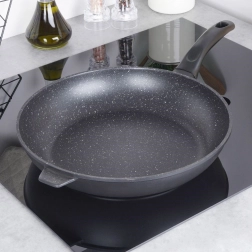 Solidna granitowa patelnia o średnicy 32 cm do codziennego smażenia i duszenia. Dzięki nieprzywierającej powłoce Pfluon Granit bez PFOA/PTFE przygotujesz potrawy z minimalną ilością tłuszczu, z równomiernym rozprowadzaniem ciepła i szybkim nagrzewaniem. Odpowiednia na wszystkie typy kuchenek, w tym indukcję, oraz do zmywarki.
