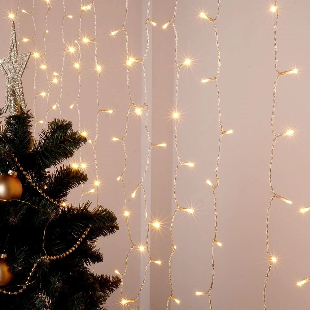 Stylowa wisząca świetlna kurtyna o długości 2 m i wysokości 1,5 m rozświetli dom i ogród. Oferuje 240 ciepłych białych LED, 12 trybów świecenia z pamięcią, przezroczyste przewody dla eleganckiego wyglądu oraz klasę szczelności IP44 do bezpiecznego użytku na zewnątrz. Idealna jako świąteczna dekoracja na elewację, balkon, balustradę lub kominek.