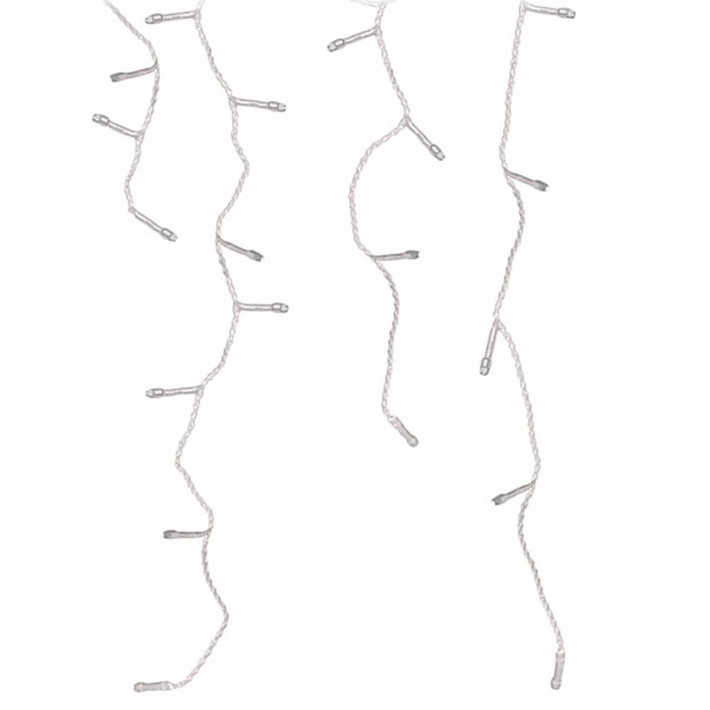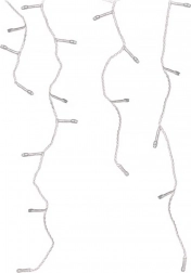 Zasłona ma różne długości zwisów z rozstawem ok. 15 cm i świeci światłem stałym. Od zasilacza prowadzi 3‑metrowy przewód zasilający, co ułatwia rozmieszczenie i podłączenie do gniazdka. Dzięki klasie IP44 dekoracja jest odporna na warunki pogodowe i bezpieczna do użytku na zewnątrz.