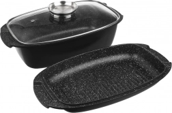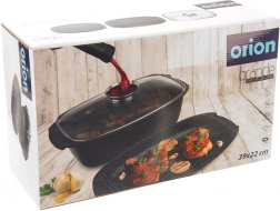 Zawartość opakowania: 1× głęboka prostokątna brytfanna (zewnętrzne 39 × 22 × 10 cm; wewnętrzne 32 × 21 × 9,5 cm; 5 l), 1× patelnia grillowa/pokrywka (zewnętrzne 39 × 22 × 5 cm; wewnętrzne 31 × 20 × 4 cm; 2 l), 1× szklana pokrywka (zewnętrzne 34 × 22,5 × 6,5 cm). ORION – oryginalny produkt wykonany zgodnie z europejskimi standardami.