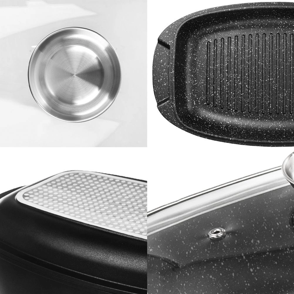 Maksymalna uniwersalność w jednym zestawie. Patelnię grillową można używać samodzielnie lub jako pokrywkę do brytfanny – oszczędza miejsce i czas podczas gotowania oraz pieczenia.