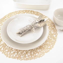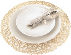 Elegancka okrągła podkładka na stół o średnicy 39 cm w złotym kolorze doda Twojemu stołowi luksusowego wyglądu i jednocześnie niezawodnie go ochroni. Jest elastyczna, łatwa w czyszczeniu i praktyczna do codziennego użytku w kuchni i salonie. Chroni powierzchnię przed zarysowaniami i zabrudzeniami oraz tworzy dekoracyjne tło dla talerzy i sztućców.