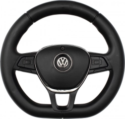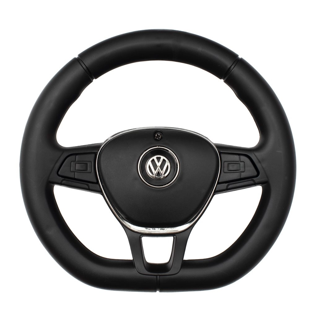 Dla młodszych dzieci prowadnik służy do wygodnego sterowania przez rodzica, starsi kierowcy docenią możliwość samodzielnej jazdy odpychając się nóżkami. Trójramienna kierownica z logo VW ma klakson i wesołe melodie (zasilanie 2× AA, brak w zestawie). Praktyczny schowek pod siedzeniem pomieści drobiazgi w podróży, a składane podnóżki i odpinane podłokietniki zwiększają komfort.