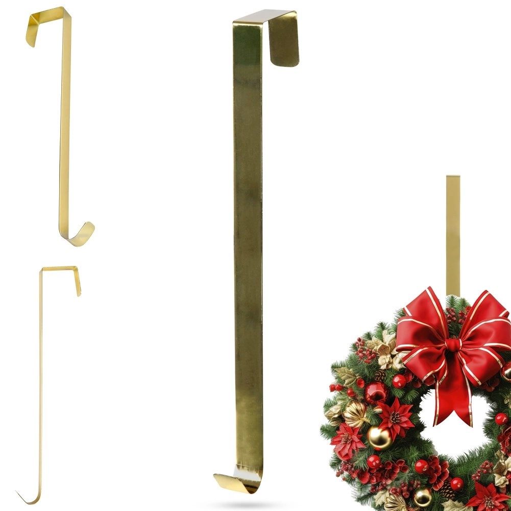 Elegancki złoty wieszak na wieniec o wysokości 30 cm do zawieszania dekoracji na górnej krawędzi drzwi. Oferuje łatwy montaż bez narzędzi, solidne metalowe wykonanie oraz efektowny złoty wygląd, który podkreśli bożonarodzeniowe, zimowe i jesienne ozdoby. Odpowiedni do drzwi o szerokości do 5 cm i do użytku wewnątrz lub pod zadaszeniem.