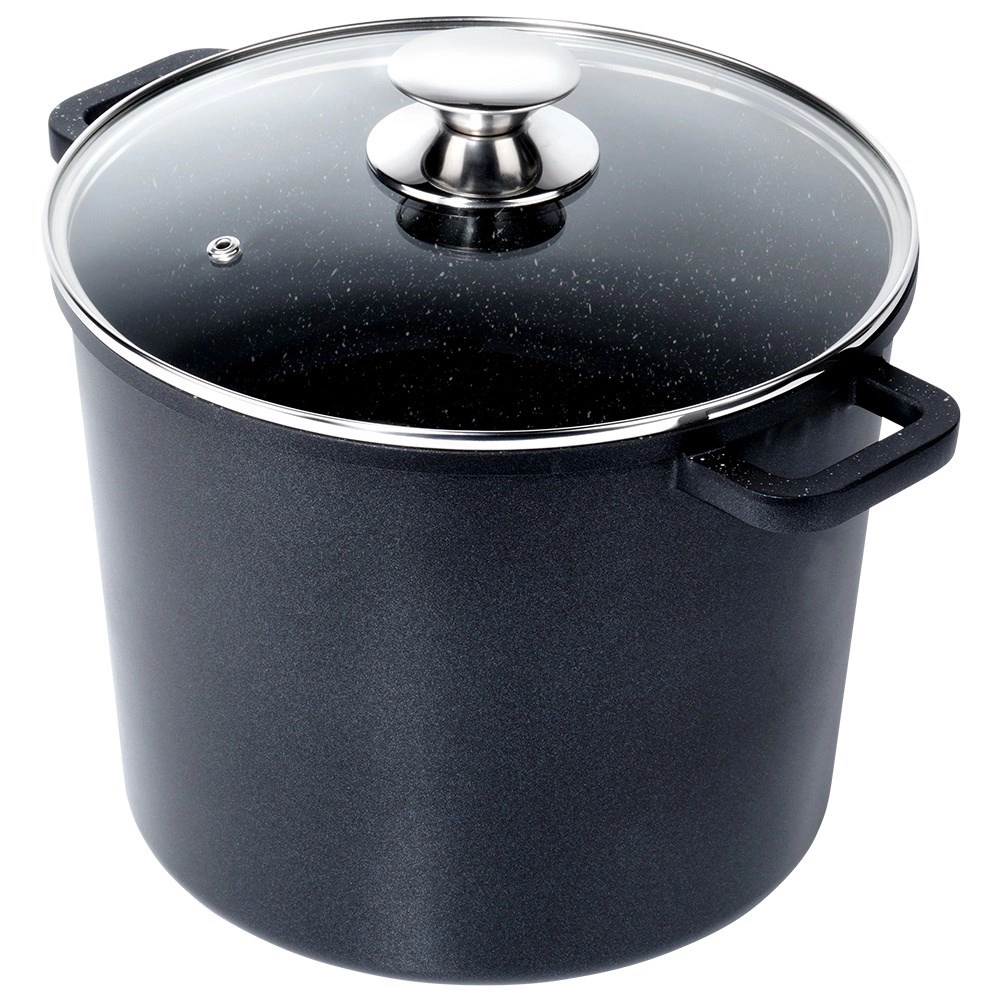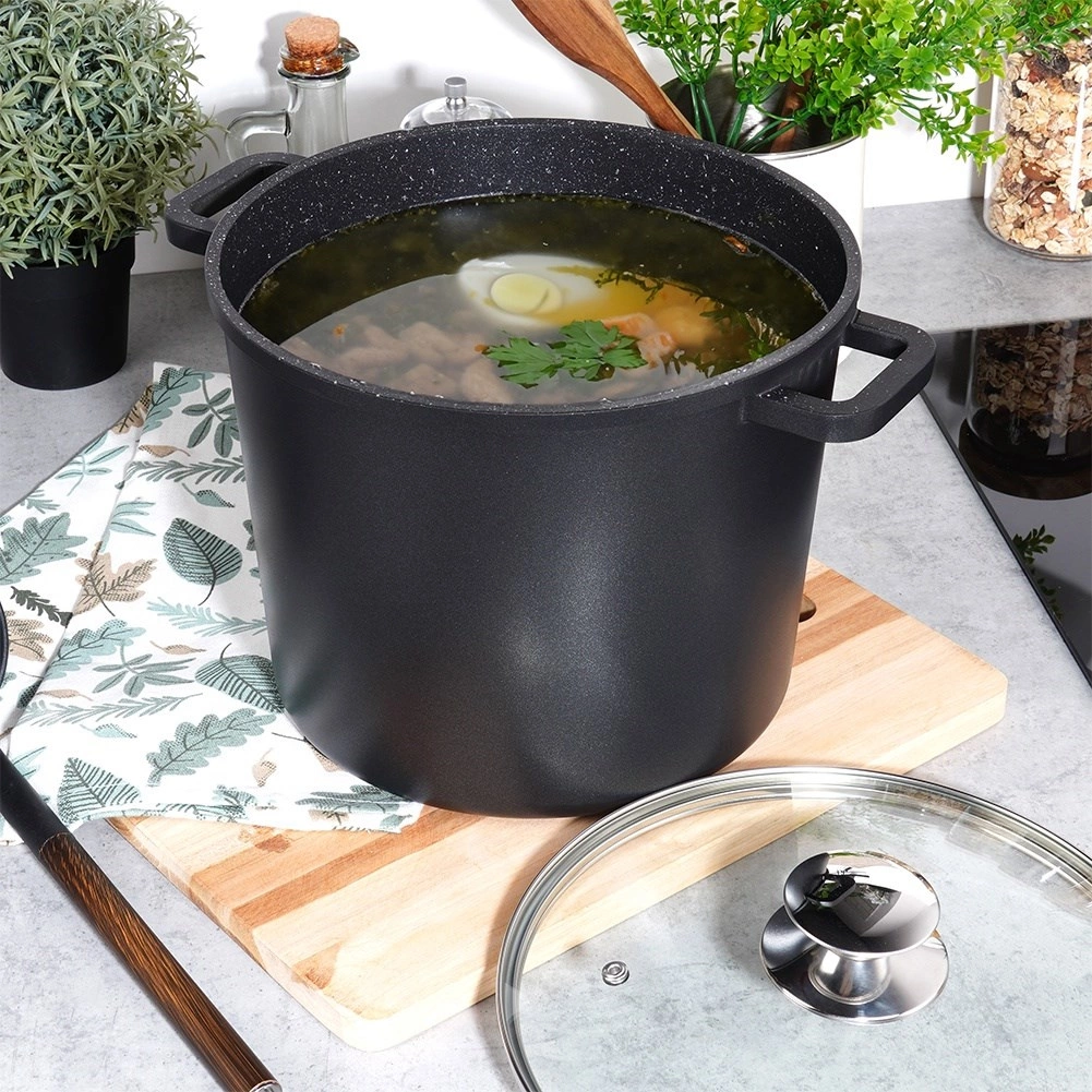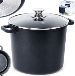 Duży, wysoki garnek GRANDE o pojemności 7,6 l i średnicy 25 cm jest idealny do gotowania zup, duszenia oraz przygotowywania dań dla całej rodziny. Aluminiowe korpus z wewnętrzną nieprzywierającą granitową powłoką PFLUON zapewnia łatwe gotowanie z minimalną ilością tłuszczu. Szklana pokrywka z zaworem pary, równomierne rozprowadzanie ciepła oraz kompatybilność ze wszystkimi rodzajami kuchenek, w tym indukcyjnych czynią z tego garnka uniwersalny wybór do każdej kuchni.