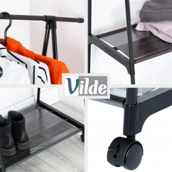 Elegancki wieszak w industrialnym stylu loft oferuje pojemny górny drążek do wieszania ubrań oraz dwie dolne półki na obuwie, torby lub pudła. Całometalowe wykonanie w czerni jest solidne, stabilne i łatwe w utrzymaniu, a tekstylne półki z poliestru są lekkie i trwałe.