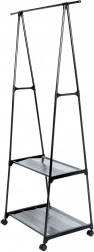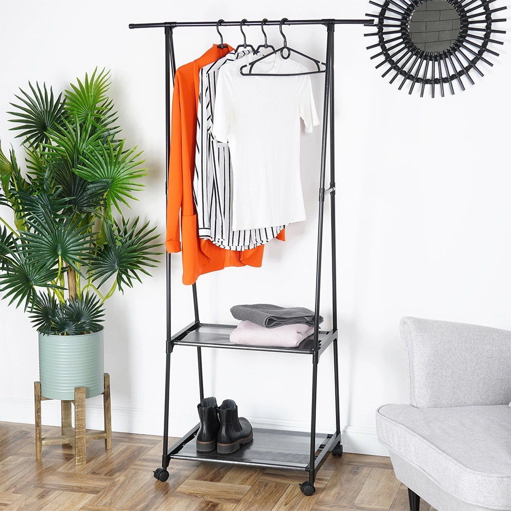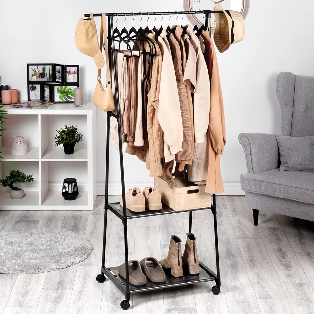 Praktyczny stojący wieszak na ubrania z wytrzymałą metalową konstrukcją i dwiema półkami na buty lub pudełka. Dzięki czterem kółkom z hamulcem łatwo go przestawić, a jednocześnie świetnie oszczędza miejsce w przedpokoju, sypialni i garderobie. Idealny do domu, biura i poczekalni. Stabilne, mobilne i oszczędzające miejsce rozwiązanie do przejrzystej organizacji garderoby.