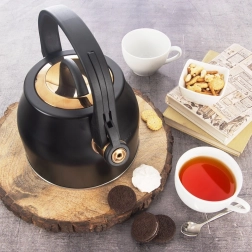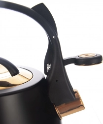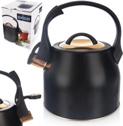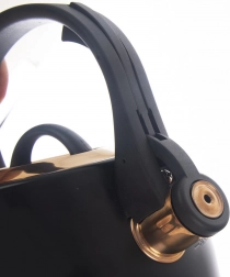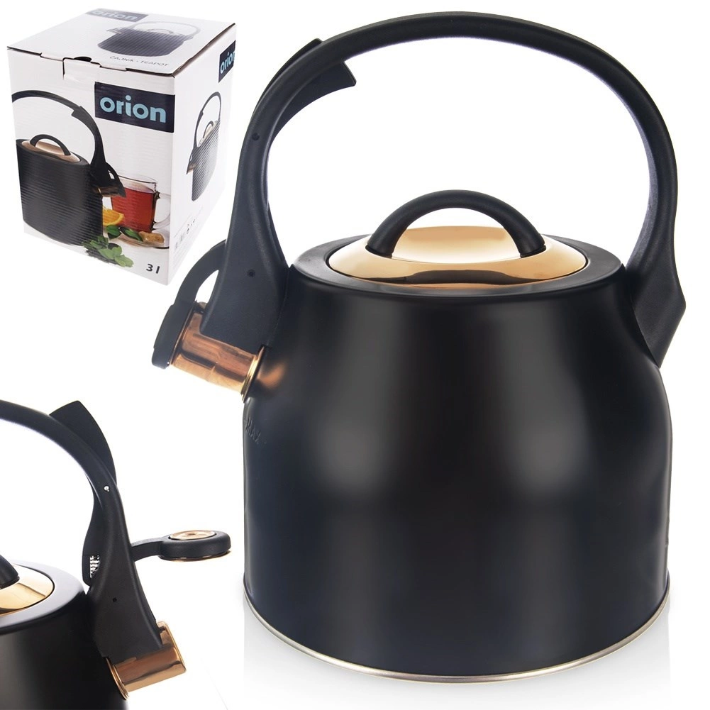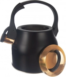Elegancki stalowy czajnik z gwizdkiem w matowej czerni ze złotymi akcentami łączy styl i funkcjonalność. Ma pojemność 3 l (użytkową 1,8 l), ergonomiczny uchwyt, odchylany gwizdek oraz łatwo zdejmowaną pokrywkę. Odpowiedni na wszystkie typy kuchenek, w tym indukcję, idealny do codziennego gotowania wody na herbatę, kawę i zioła.