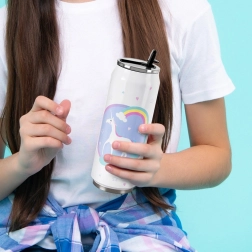 Rozkoszuj się ulubionymi napojami w termokubku z radosnym motywem jednorożca. Biała, stalowa powierzchnia świetnie sprawdzi się w mieście i w plenerze, a dzięki kompaktowym wymiarom 7 × 19 cm pasuje do większości uchwytów na napoje. Izolacja próżniowa niezawodnie utrzymuje pożądaną temperaturę przez cały dzień.