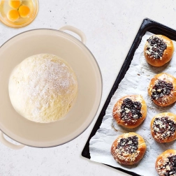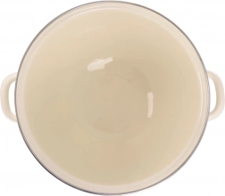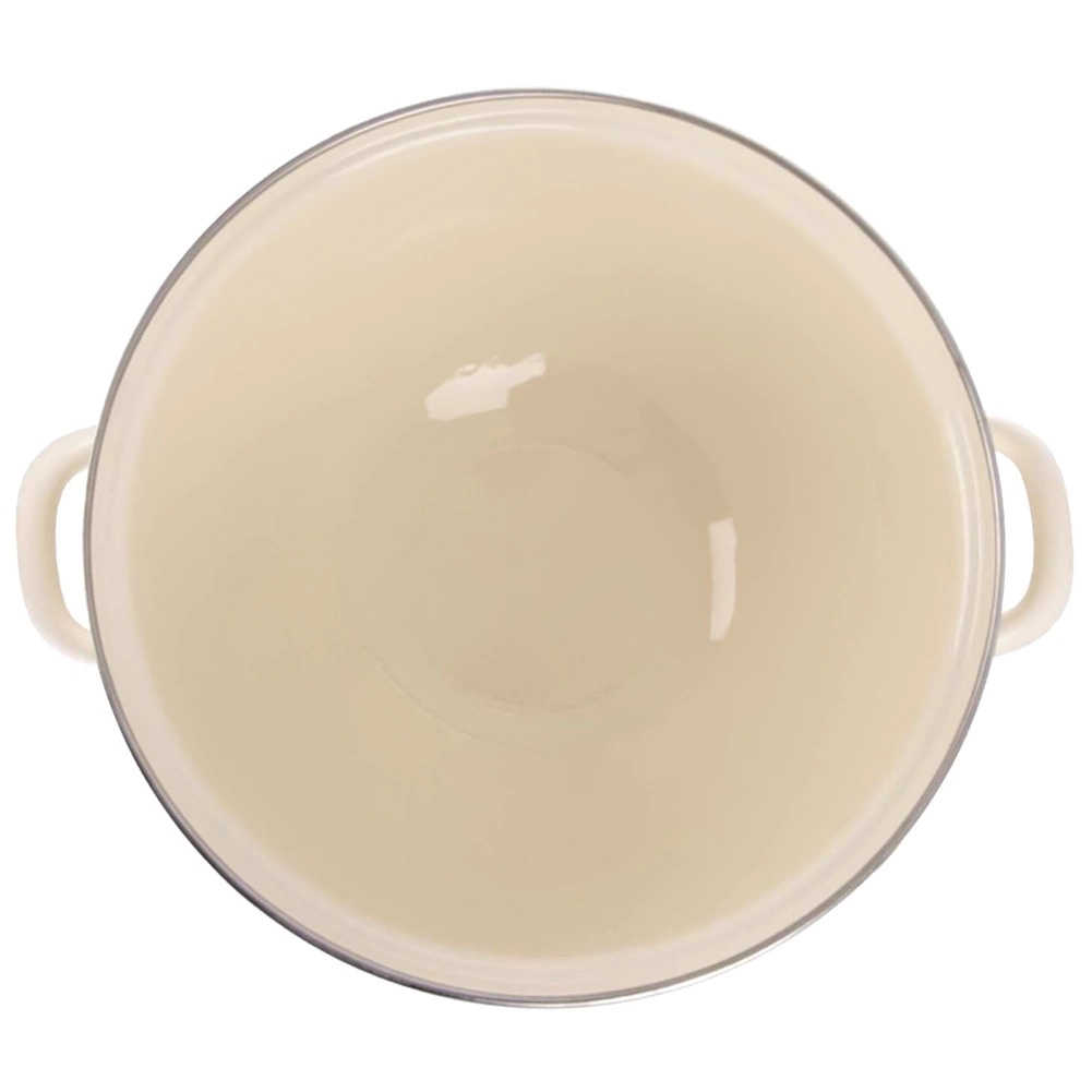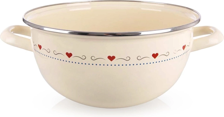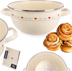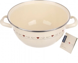 Praktyczna emaliowana miska o pojemności 5 l w kremowym kolorze z delikatnym motywem serc. Ma wygodne uchwyty ułatwiające przenoszenie, nierdzewną krawędź i jest odpowiednia do zmywarki. Świetnie sprawdzi się do mieszania, wyrabiania ciasta oraz serwowania, a dzięki wytrzymałej emaliowanej stali jest bezpieczna dla zdrowia i odpowiednia także dla alergików.
