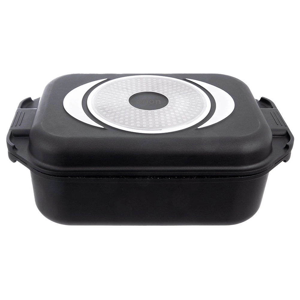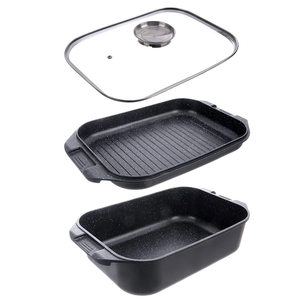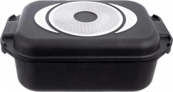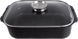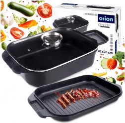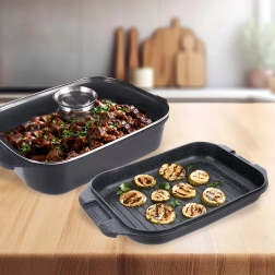 Uniwersalny zestaw do codziennego gotowania: przestronna brytfanna 7 l z pokrywą w formie patelni grillowej oraz oddzielną żaroodporną szklaną pokrywą z dozownikiem płynnych przypraw. Podwójna granitowa warstwa PFLUON GRANIT na aluminiowym odlewie zapewnia doskonałą nieprzywieralność, równomierne rozprowadzanie ciepła i łatwiejsze czyszczenie.