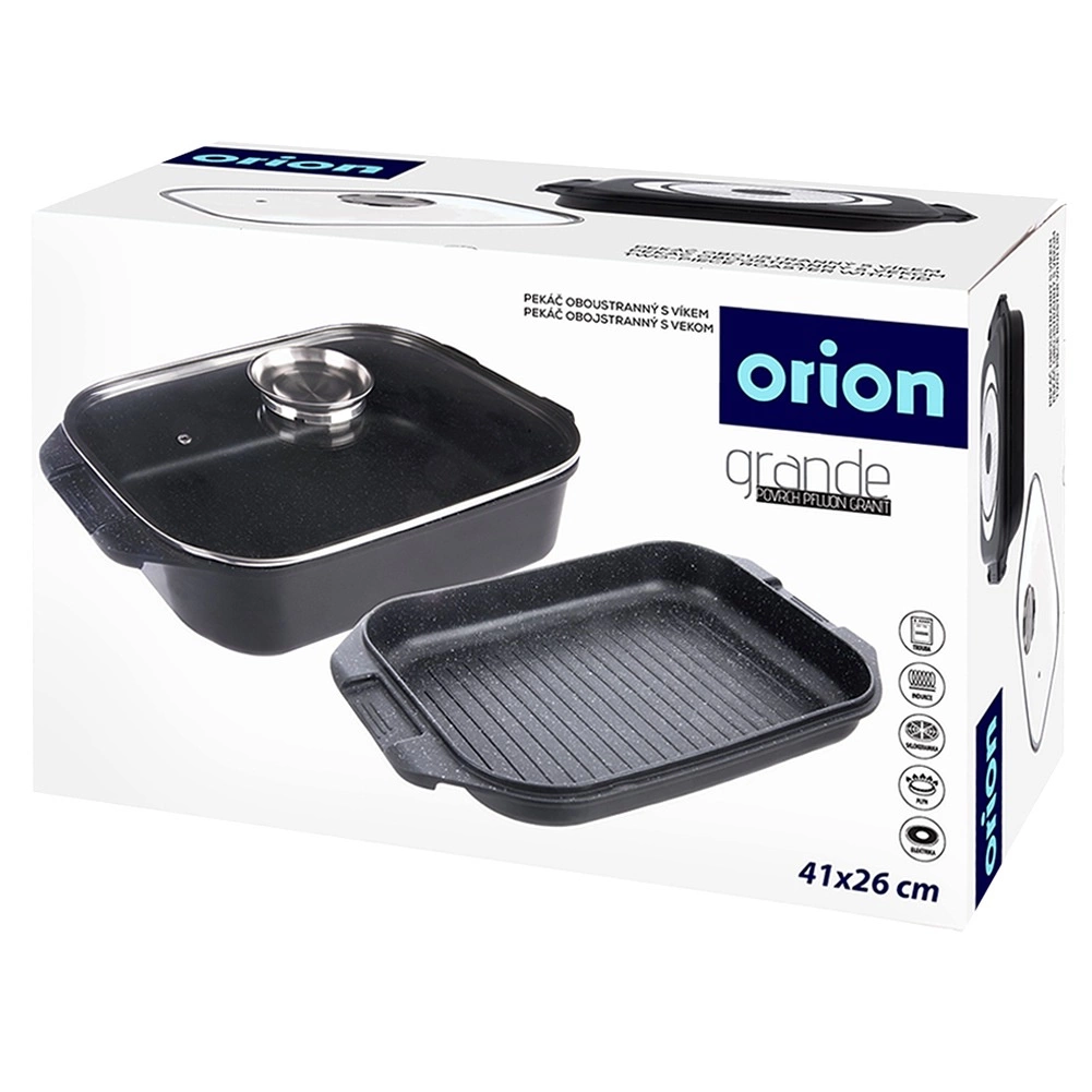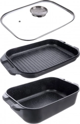 Patelnię grillową można używać samodzielnie lub jako pokrywę brytfanny – idealna do smażenia, pieczenia i duszenia. Szklana pokrywa z praktycznym dozownikiem pozwala dolewać wodę, wino lub płynne przyprawy bez podnoszenia pokrywy. Strona zewnętrzna jest pokryta nieprzywierającą warstwą PTFE dla łatwej pielęgnacji.