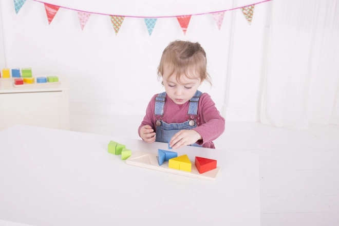 Proste kształty i wyraziste kolory (czerwony, niebieski, zielony, żółty) wspierają percepcję wzrokową i logiczne porządkowanie. Wkładanie w odpowiednie miejsca wzmacnia prawidłowe dopasowywanie.