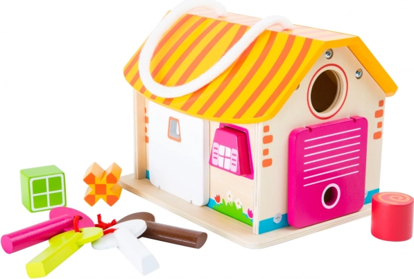 Ten drewniany domek świetnie nadaje się do ćwiczenia umiejętności motorycznych dzieci. Każdy klucz pasuje do innych drzwi. Dzięki gumkom pozostają one otwarte. Klocki mają różne kształty, które należy włożyć do odpowiednich otworów. Do przenoszenia domku służy sznurek. Główne właściwości: zawiera 9 elementów, ćwiczenie umiejętności motorycznych, kolorowe wykonanie