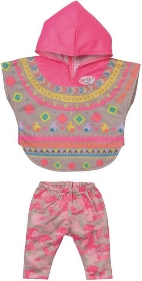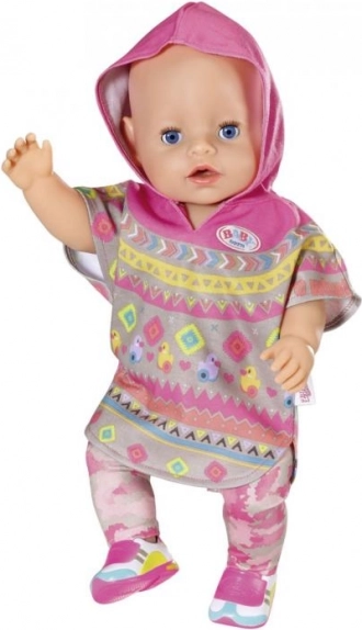 Stylowy zestaw ubranek dla lalek BABY born o wysokości 43 cm wnosi do zabawy więcej fantazji i uroczego stylu. Zawiera miękkie ponczo z kapturem, modne spodnie oraz dobrane buciki. Idealny dla dzieci od 3 lat, które uwielbiają przebieranie i opiekę nad swoimi lalkami. Wysoka jakość wykonania zapewnia łatwe ubieranie i doskonale dopasowany krój.