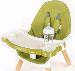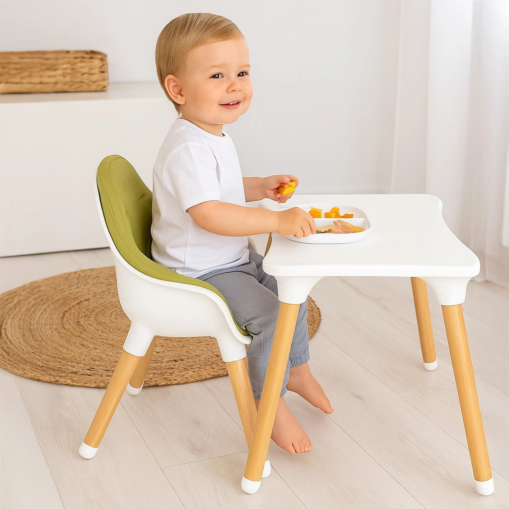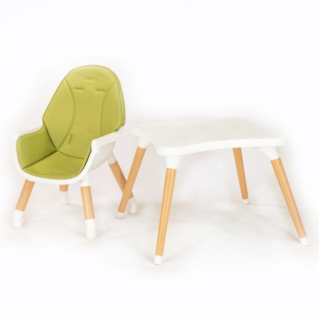 Nowoczesne dziecięce krzesełko do karmienia 3w1 NEW BABY Grace w eleganckim zielonym kolorze łączy wysokie krzesełko, niskie krzesełko oraz zestaw stolik + krzesełko. Oferuje stabilną konstrukcję, 5-punktowe pasy bezpieczeństwa z miękkimi ochraniaczami, łatwe w czyszczeniu tapicerowanie z ekoskóry oraz wyjmowaną tackę z uchwytami na butelkę lub kubek. Idealne od pierwszych posiłków aż po kreatywną zabawę i rysowanie.