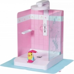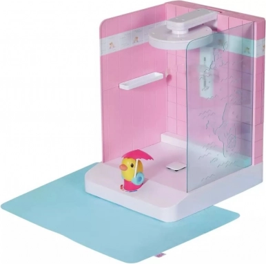Praktyczny uchwyt na lalkę bezpiecznie utrzyma bobaska BABY born i starsze rodzeństwo na miejscu, a regulowana wysokość prysznica dostosuje się do obu rozmiarów. W zestawie znajduje się także mata przeciw rozchlapywaniu wody, która utrzymuje otoczenie w suchości. Elegancki design z różowymi kafelkami doskonale pasuje do dodatków z kolekcji Łazienka.