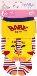 Rajstopy Baby Born zapewniają wygodę i styl w jednym opakowaniu, wzbogacone o wesołe wzory. Dzięki motywom króliczka Benno i pieska Bello dzieci będą zachwycone. Pierwszy zestaw w połączeniu różu i błękitu zaskakuje Bennem machającym z różowych rajstop z niebieskim konfetti oraz króliczkiem na niebieskich paskach. Drugi zestaw oferuje słonecznie żółte i kolorowo paskowane rajstopy z obrazkiem pieska.