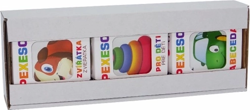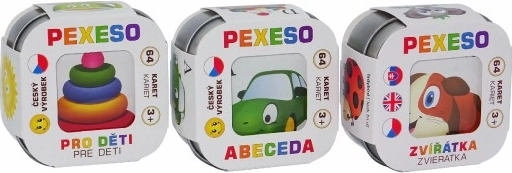 Pexeso jest jedną z najbardziej lubianych dziecięcych gier, która dodatkowo wspiera rozwój dzieci. Ten zestaw zawiera trzy różne pexesa w metalowych pudełeczkach, skoncentrowane na alfabecie, zwierzątkach z językiem angielskim i grach dla dzieci.