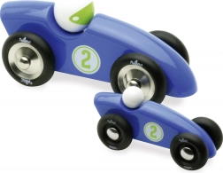 To eleganckie drewniane auto wyścigowe w niebieskim kolorze łączy wysoką jakość rzemieślniczego wykonania z ikonicznym stylem marki VILAC. Gumowane metalowe koła zapewniają cichy i płynny ruch po różnych powierzchniach, a trwała lakierowana powłoka chroni zabawkę przed zarysowaniami.