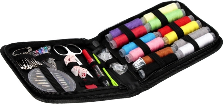 - 12 nici, zestaw igieł, szpilki, agrafki, 4 guziki, centymetr krawiecki, nożyczki