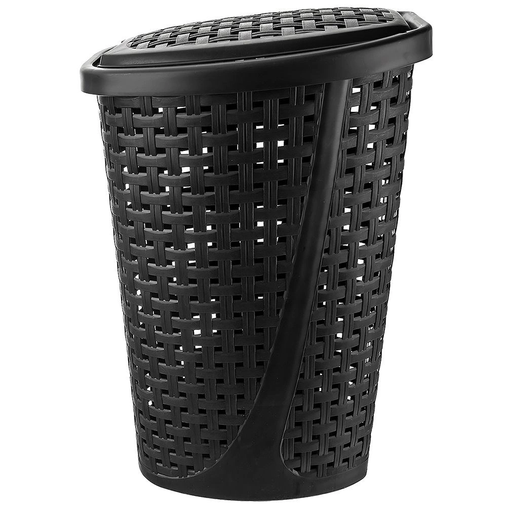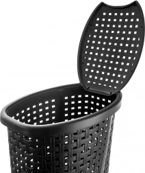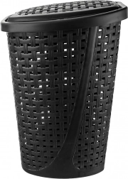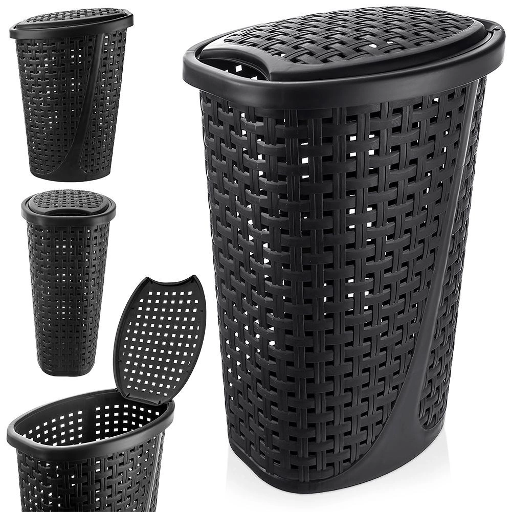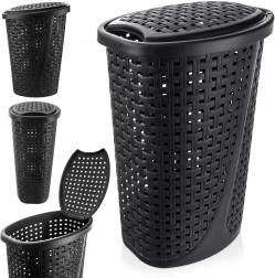 Praktyczny kosz na pranie o pojemności 45 l z zamykaną pokrywą w eleganckim czarnym kolorze. Dzięki wąskiej formie, wentylowanemu rattanowemu wyglądowi i lekkiej, lecz wytrzymałej plastikowej konstrukcji świetnie pasuje obok pralki i do mniejszych łazienek. Zintegrowane uchwyty, oddychające perforacje ograniczające zapachy oraz łatwe otwieranie pokrywy zapewniają wygodne, codzienne użytkowanie.