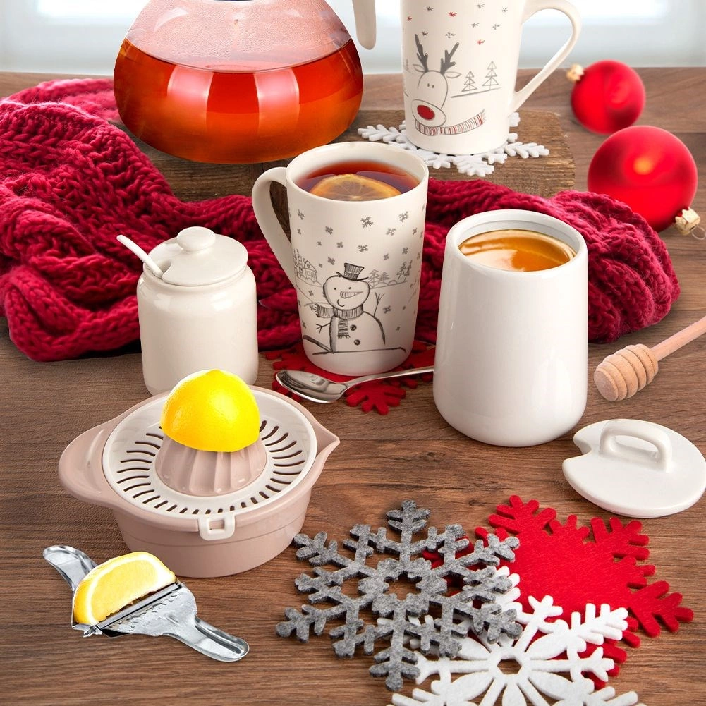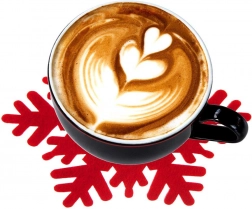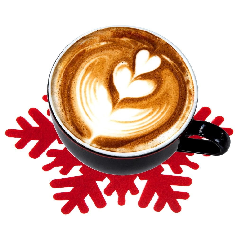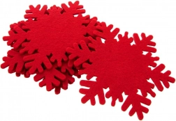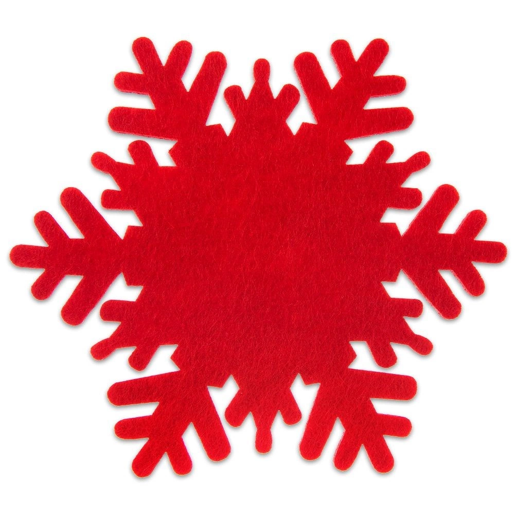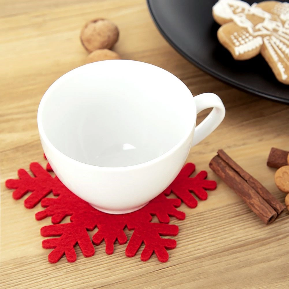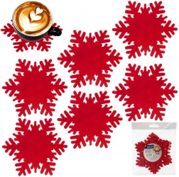 Stylowe filcowe podkładki w kształcie płatka śniegu w czerwonym kolorze chronią stół przed ciepłem, wilgocią i zarysowaniami, dodając świątecznego nastroju. W opakowaniu 6 sztuk o wymiarach 13,5 × 13 cm. Idealne pod kubki, szklanki i filiżanki – świetne jako dekoracja, praktyczna ochrona powierzchni i zimowy/świąteczny dodatek stołu.