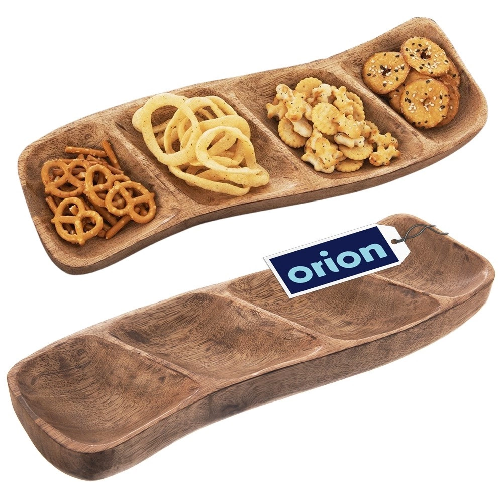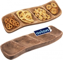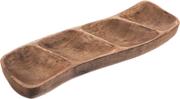 Elegancki drewniany talerz do serwowania z 4 przegródkami z wytrzymałego drewna mango. Ręcznie wykonany, z naturalnym rysunkiem i uniwersalnym zastosowaniem do orzechów, oliwek, suszonych owoców, dipów i sosów. Stylowa prezentacja przekąsek w domu i w restauracji.