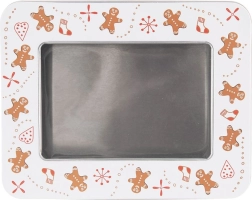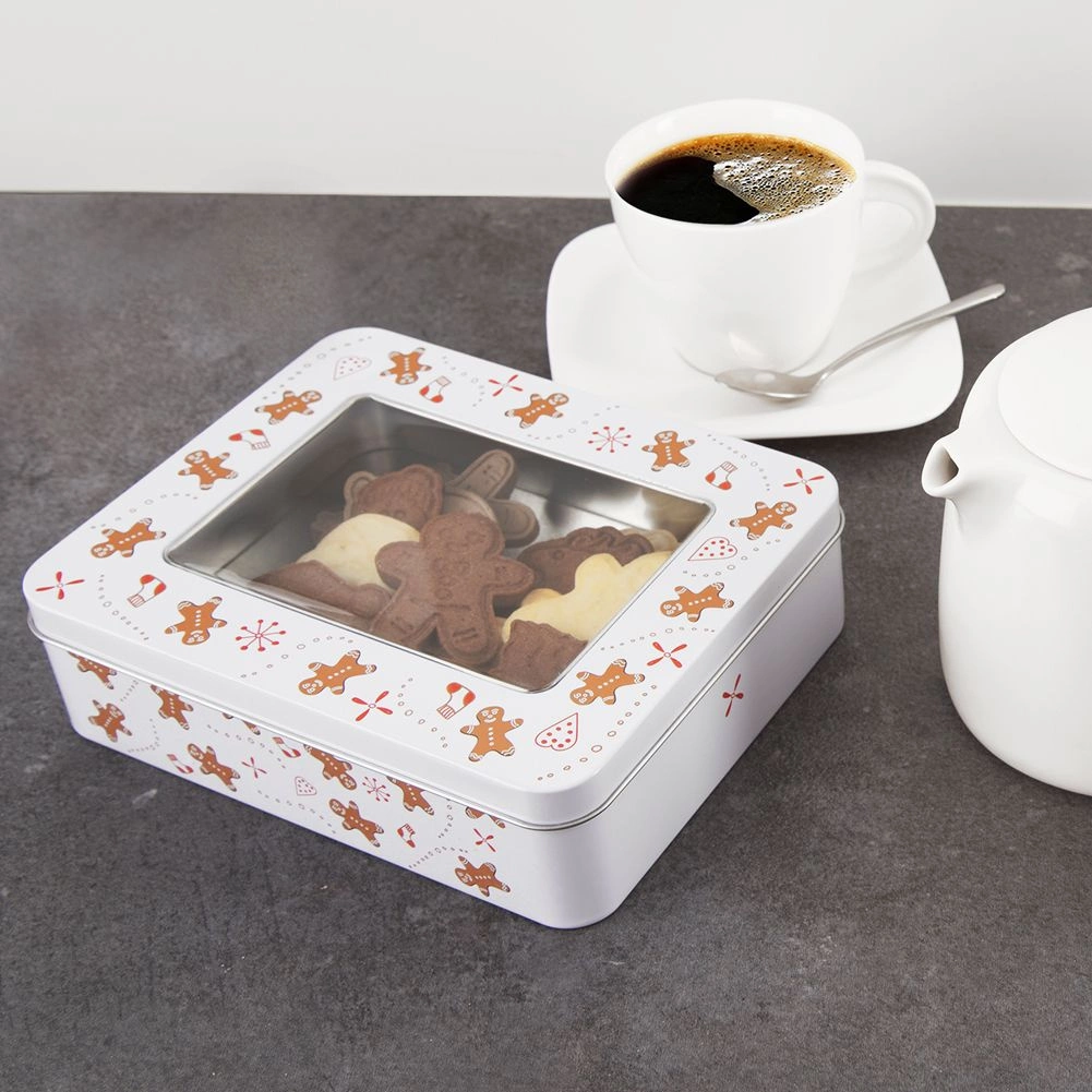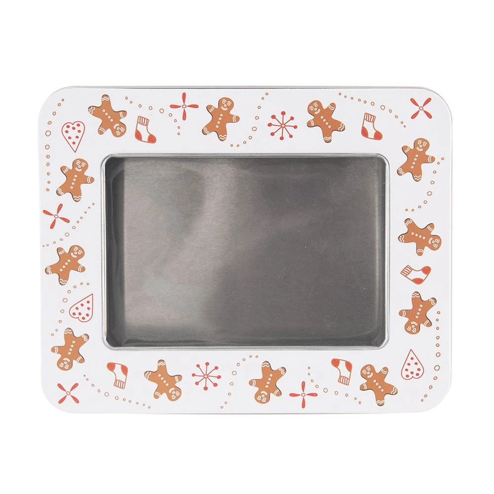 Ta prostokątna metalowa puszka w białym kolorze ze świątecznym motywem pierniczków doskonale nadaje się do przechowywania ciasteczek, pierniczków i drobnych słodkości. Dzięki przezroczystemu okienku w pokrywce zawartość jest zawsze widoczna, a Twoje wypieki pięknie się prezentują.