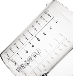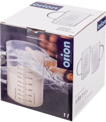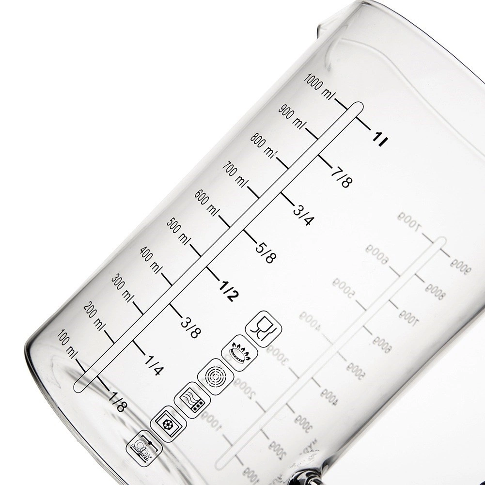 Skale są dobrze czytelne i pozwalają na szybkie, niezawodne odmierzanie. Znajdziesz tu pomiar płynów w ml (100–1000 ml) oraz w litrach (1/8 l – 1 l), a także przeliczenia dla mąki (100–700 g) i cukru (100–900 g). Maksymalna oznaczona pojemność to 1 l, rzeczywista objętość dzbanka wynosi do 1,2 l.
