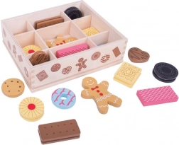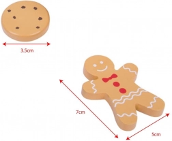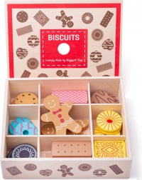 Przedstawiamy drewniane pudełko z zabawkami ciastek, które zawiera wybór ulubionych ciastek, w tym pierniczki i inne smakołyki. Ten zestaw pozwala małym dzieciom rozwijać swoją kreatywność poprzez zabawę inspirowaną pieczeniem.