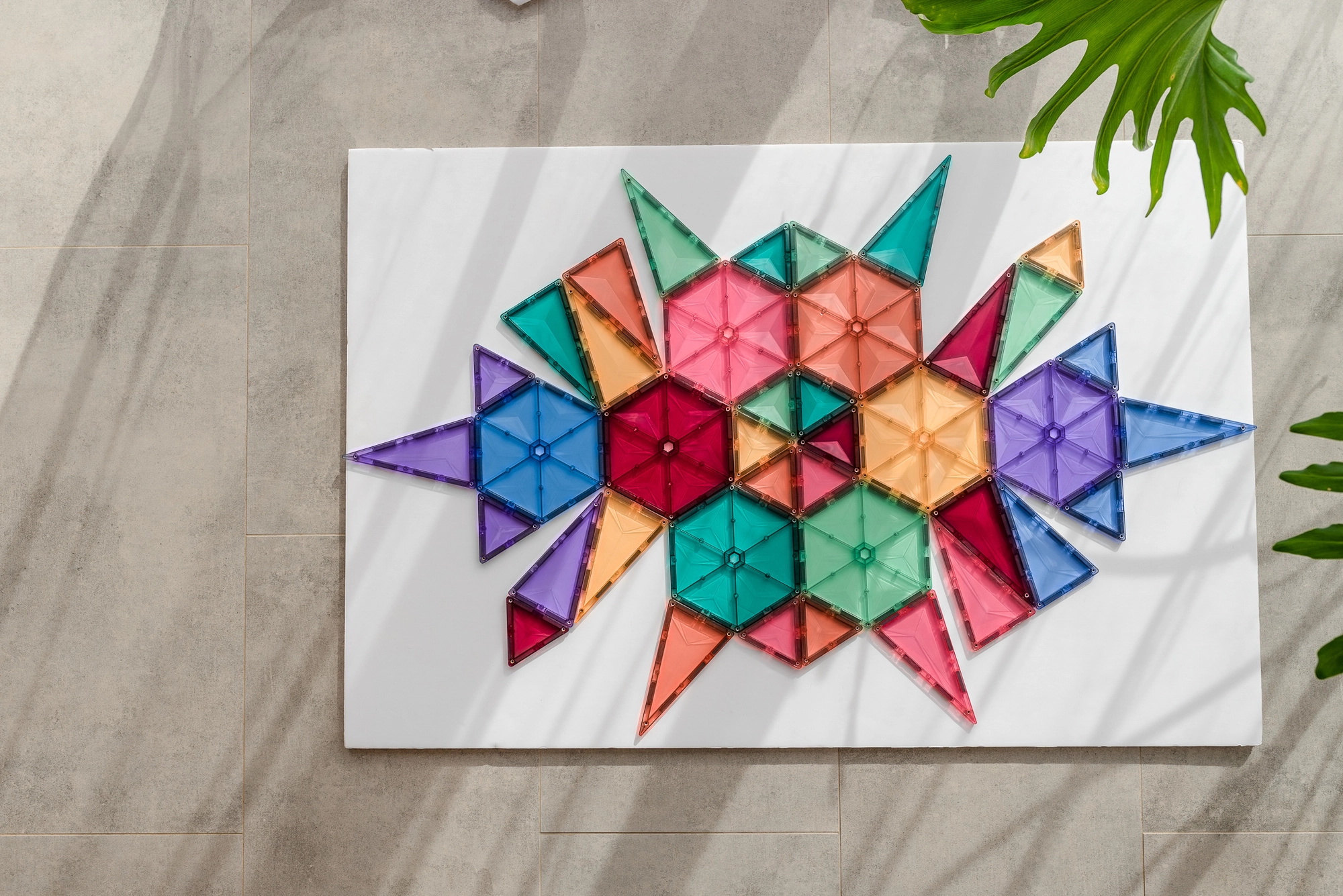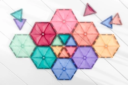 Zawiera trójkąty i sześciokąty do tworzenia motywów 2D i obiektów 3D. Idealny do rozwijania symetrii, relacji przestrzennych i wzorów.