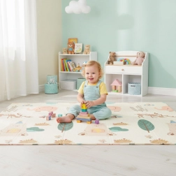 Ta dziecięca mata do zabawy z wysokiej jakości pianki XPE tworzy miękkie, bezpieczne i higieniczne miejsce dla niemowląt i maluchów. Obie strony mają kolorowe, edukacyjne motywy ze zwierzątkami i elementami natury, które pobudzają kreatywność i naturalną naukę. Tekstura antypoślizgowa po obu stronach utrzymuje matę na miejscu podczas raczkowania, budowania z klocków i stawiania pierwszych kroków.