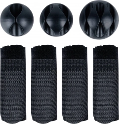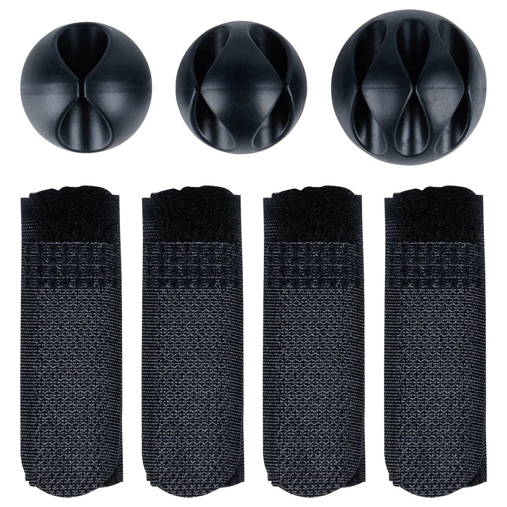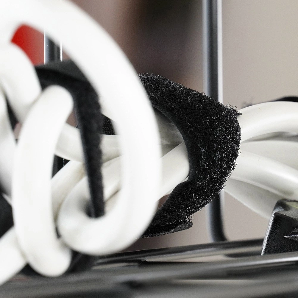 W zestawie śruby z podkładkami, opaski na rzep i samoprzylepne klipsy – dla solidnego montażu kosza i estetycznego prowadzenia kabli.