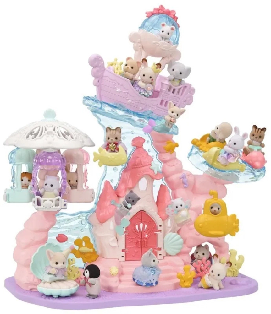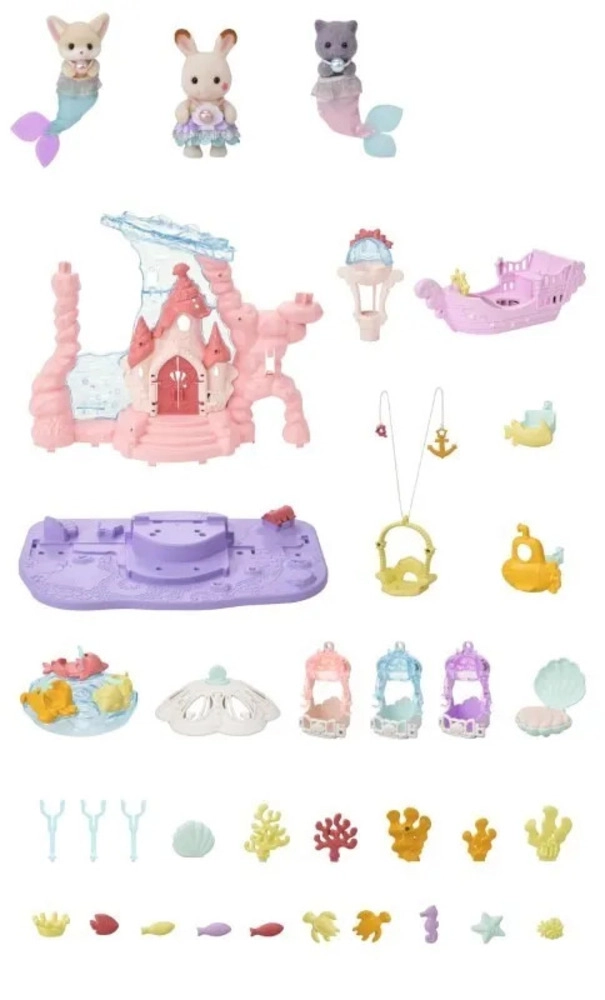 Wejdź do świata magii z podwodnym pałacem, który jest pełen interaktywnych funkcji. Dzieci mogą przewozić swoje figurki kolejką linową, rozkręcić karuzelę z meduzami i morskimi stworzeniami, płynąć łodzią podwodną lub przejechać się uroczą żółtą rybką. Bogate detale, przezroczyste elementy i pastelowe kolory tworzą zachwycającą scenerię do nieskończonych historii.