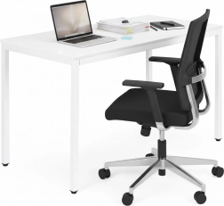 Blat z MDF pokryty melaminą jest odporny na zarysowania i łatwy w czyszczeniu. Proszkowo malowane metalowe nogi zwiększają solidność i trwałość.