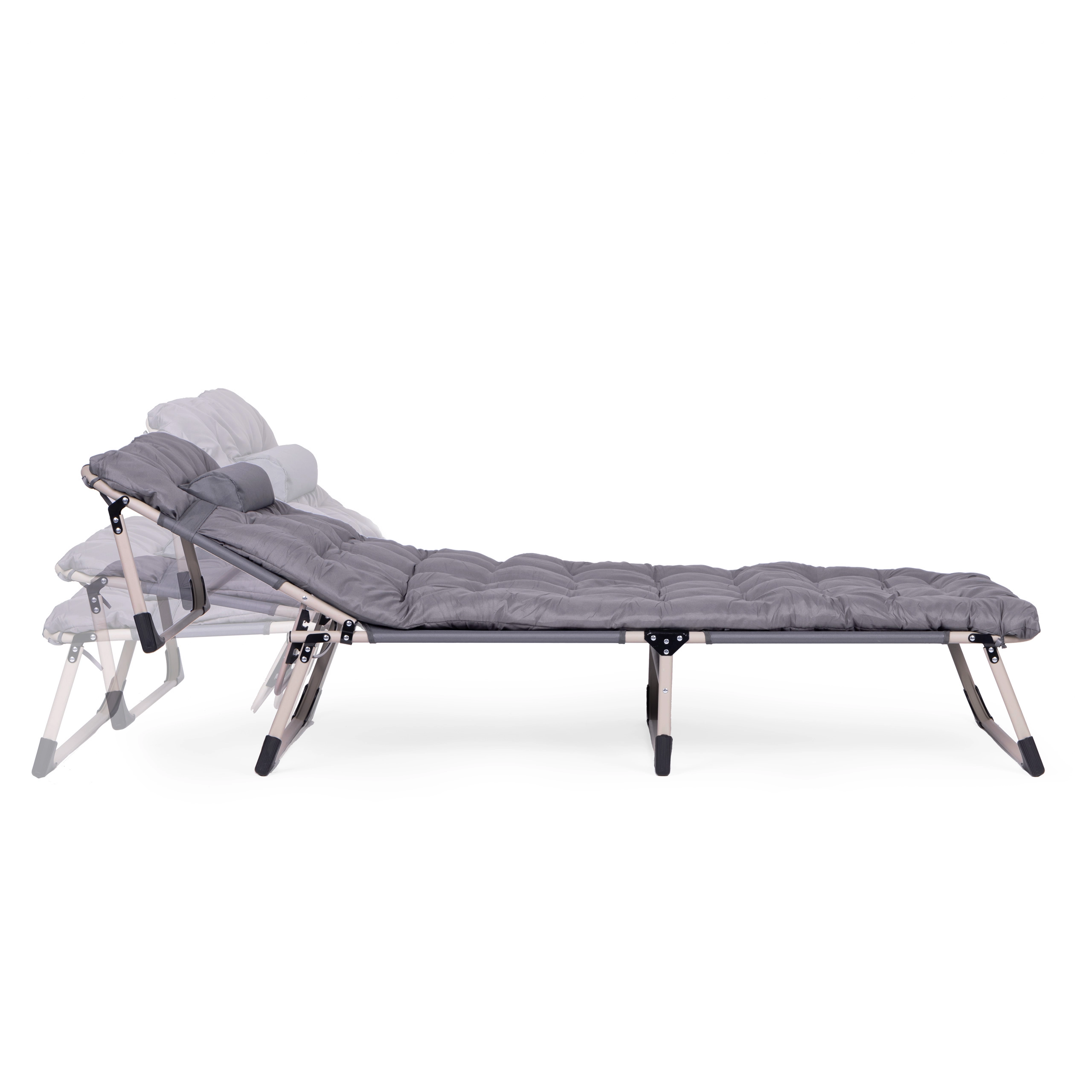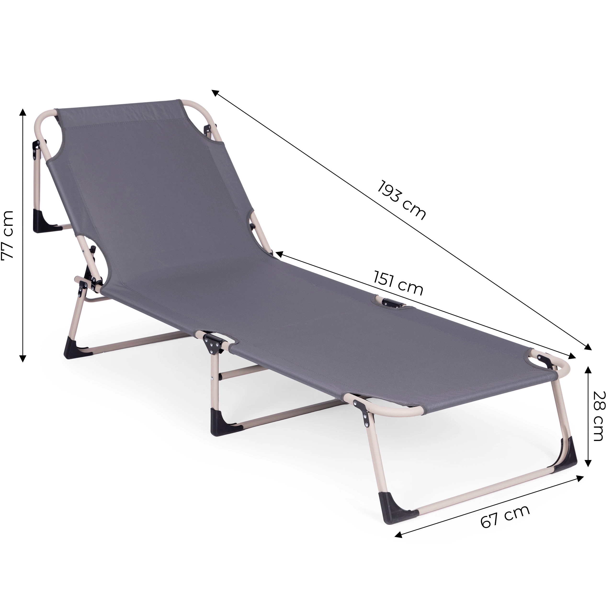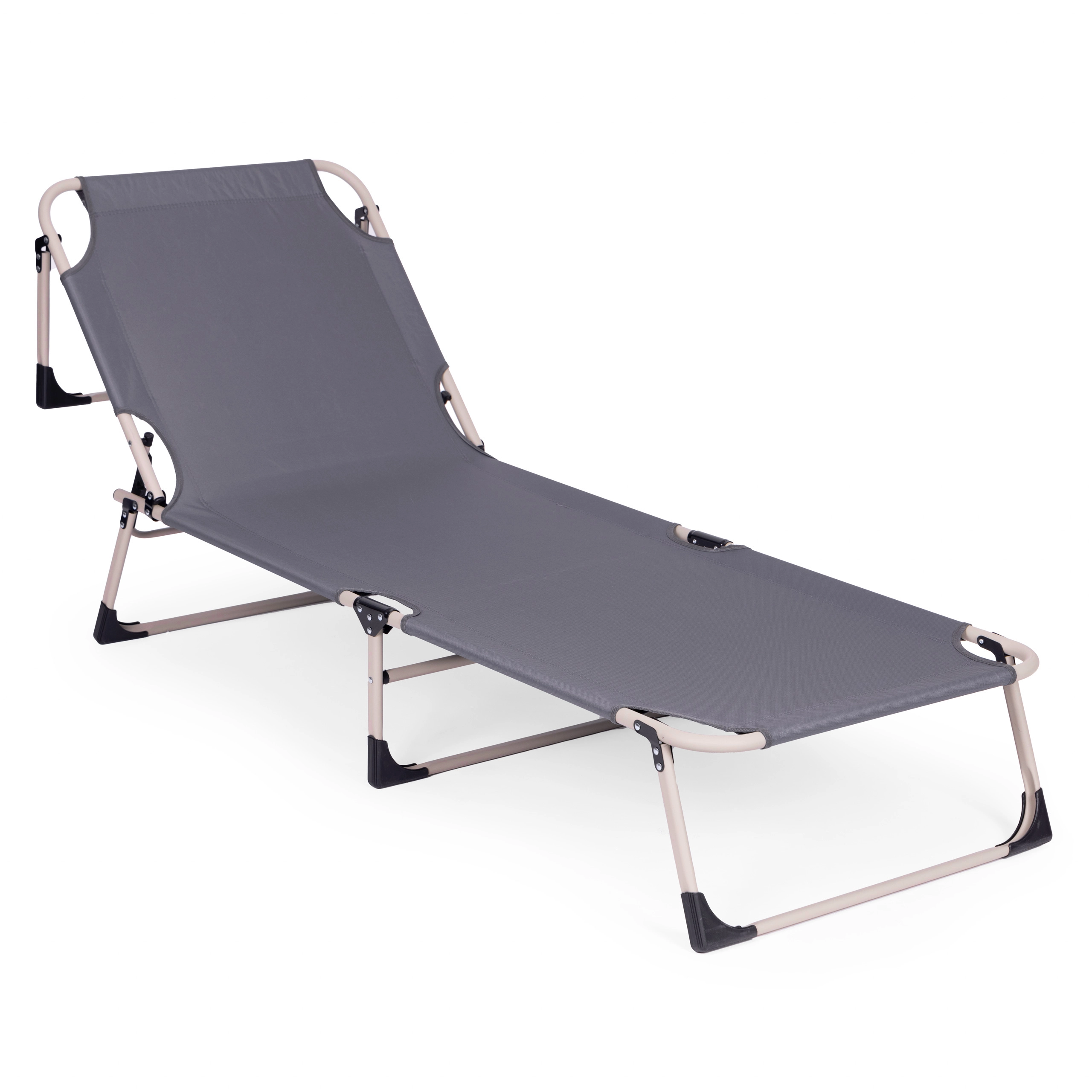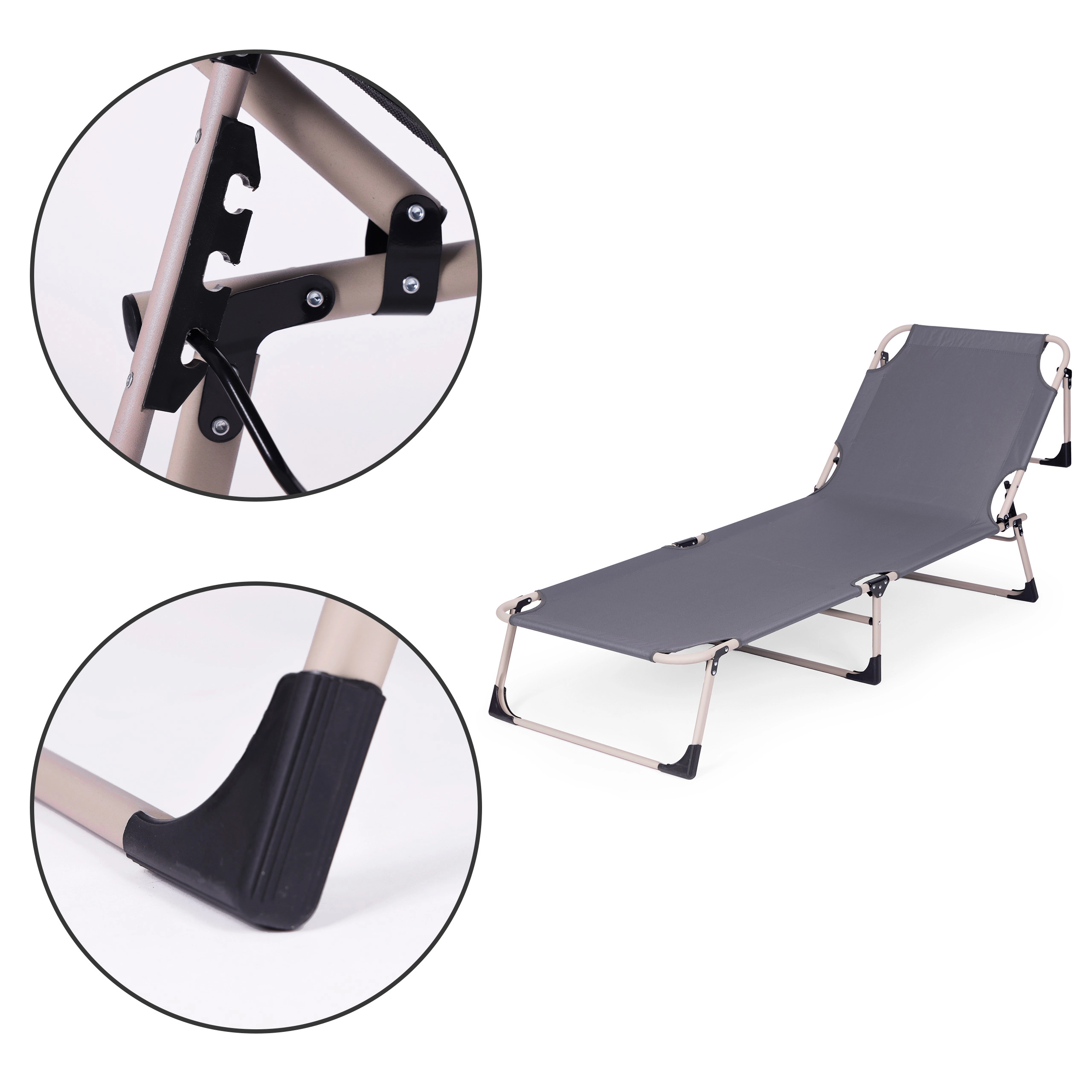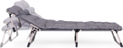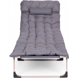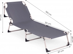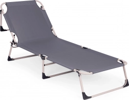 Ciesz się relaksem w ogrodzie, na rybach lub na tarasie dzięki składanemu leżakowi w uniwersalnym szarym kolorze. Oferuje miękki materac z poduszką, 4 poziomy regulacji oparcia aż do pozycji leżącej, stabilną metalową konstrukcję z antypoślizgowymi stopkami oraz łatwe składanie do transportu i przechowywania. Maksymalne obciążenie 120 kg.