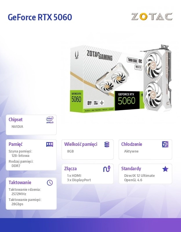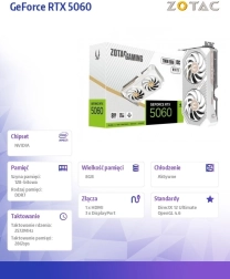 Kompaktowa karta graficzna ZOTAC GAMING GeForce RTX 5060 Twin Edge OC White oferuje wydajność nowej architektury NVIDIA Blackwell, 8 GB GDDR7, wsparcie DLSS 4 oraz efektywne podwójne chłodzenie dla płynnej rozgrywki w najnowszych tytułach.