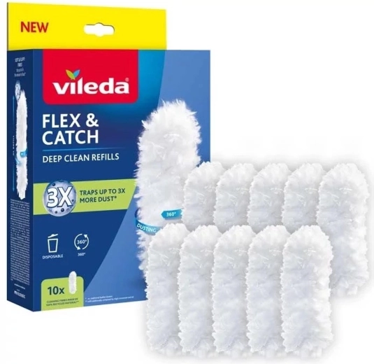 Końcówki wymienne Flex & Catch skutecznie przyciągają i zatrzymują kurz we włóknach, zamiast tylko go wzburzać. Są idealne do czyszczenia elektroniki, żaluzji oraz trudno dostępnych zakamarków. Konstrukcja 360° z włóknami dookoła całej nakładki sprawia, że kurz znika ze wszystkich stron.