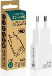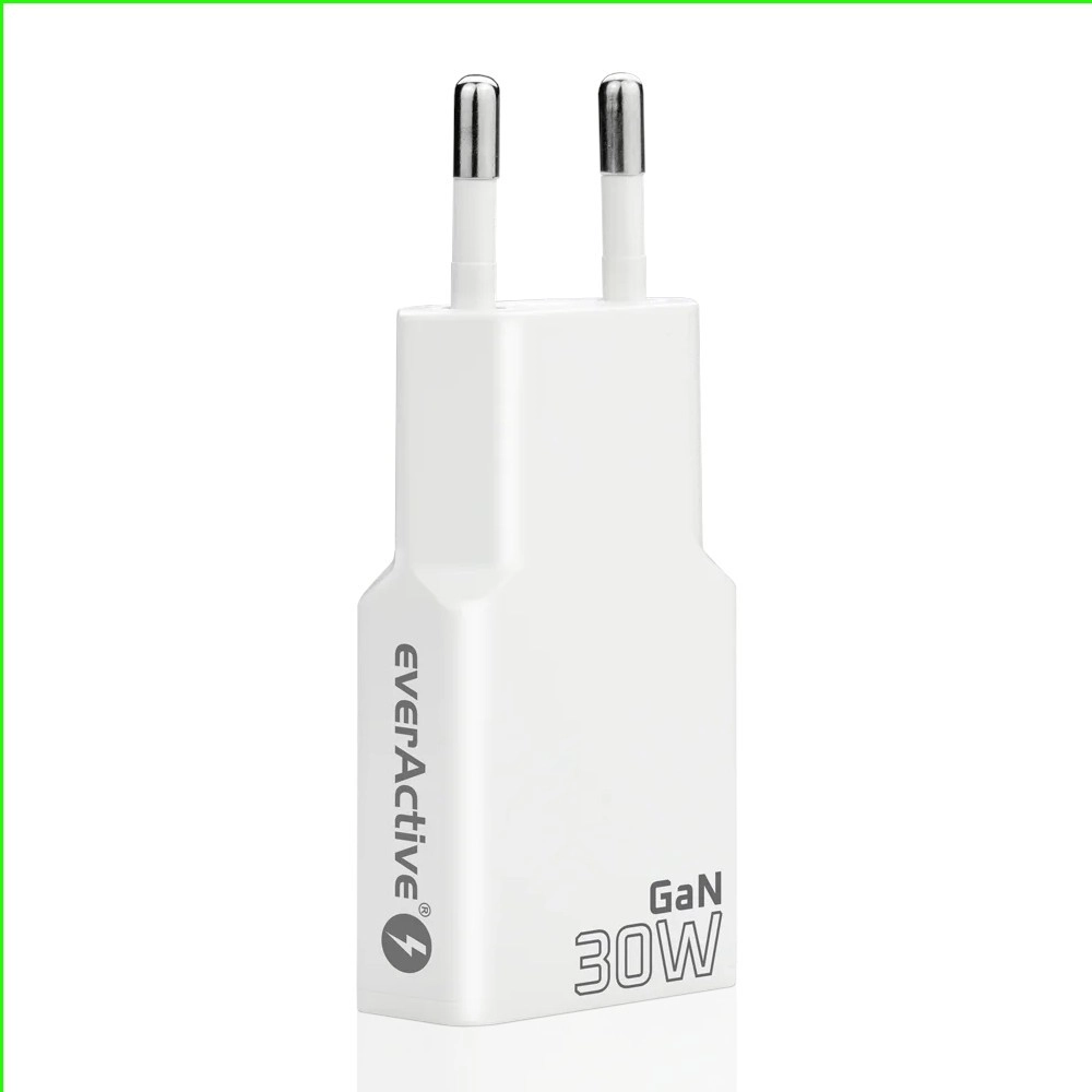 Ultracienka ładowarka sieciowa everActive z technologią GaN oferuje moc 30 W, wsparcie Power Delivery i Quick Charge 3.0. Dzięki dwóm portom USB‑C + USB‑A szybko i bezpiecznie naładuje telefon, tablet oraz drobną elektronikę w kompaktowej, podróżnej formie.