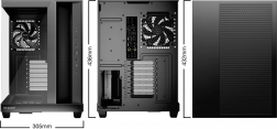 Pomimo kompaktowego rzutu obudowa mieści chłodnicę do 360 mm, płyty główne ATX oraz karty graficzne do 400 mm. Sprytny uchwyt dysków oferuje jednocześnie miejsca na 2× HDD i 2× SSD bez ograniczania przestrzeni za tacką na kable. Dwie możliwe pozycje zasilacza pozwalają wykorzystać płyty z tylnymi złączami (Asus BTF, MSI Project Zero, Gigabyte Project Stealth), nie tracąc przy tym miejsc montażowych dla nośników.