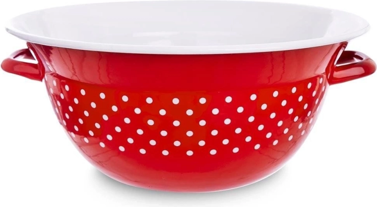 Emaliowana miska z uchwytami w lubianym stylu retro świetnie sprawdzi się do wyrabiania ciasta, mieszania składników oraz przygotowywania sałatek. Wytrzymała stal z wysokiej jakości powłoką emaliowaną jest higieniczna, neutralna smakowo i bezpieczna w codziennym kontakcie z żywnością. Eleganckie czerwone wykończenie z białymi kropkami ozdobi każdą kuchnię i stół.