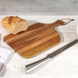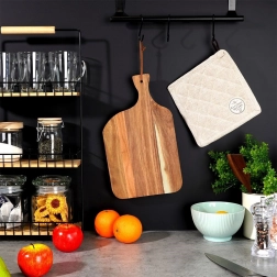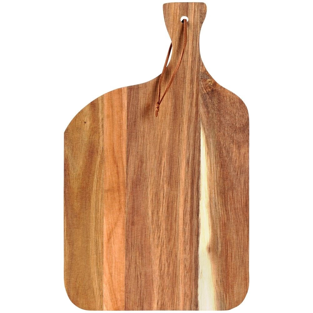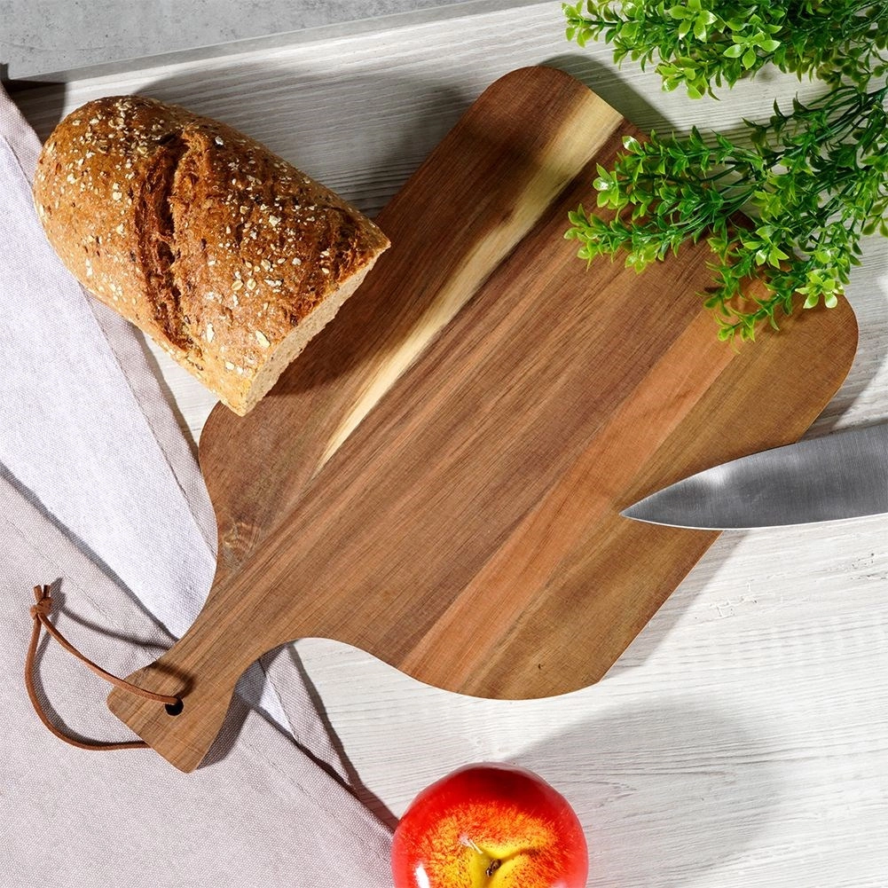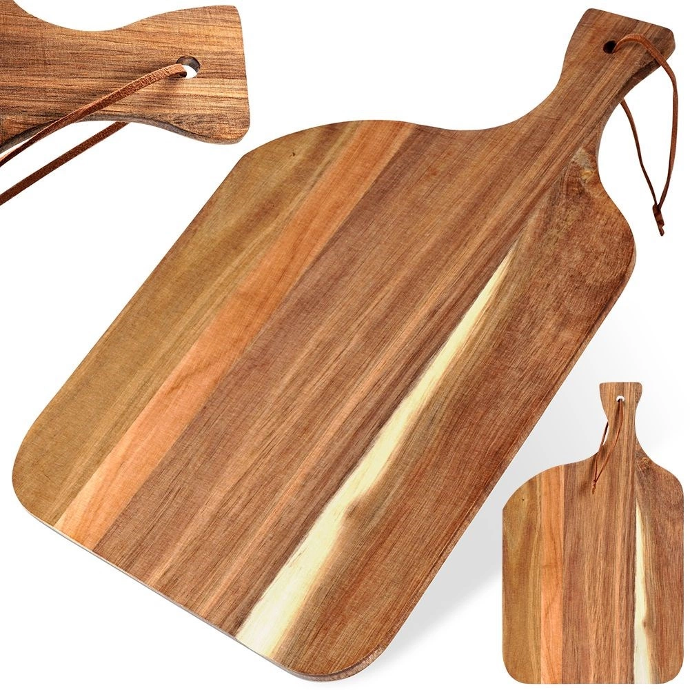 Uniwersalna deska z wysokiej jakości drewna akacjowego to praktyczny pomocnik w każdej kuchni. Wyróżnia się pięknym rysunkiem drewna, wygodnym chwytem oraz otworem ze skórzaną pętlą do łatwego zawieszenia. Doskonale sprawdzi się do krojenia mięsa, warzyw i owoców oraz serwowania serów i przystawek.