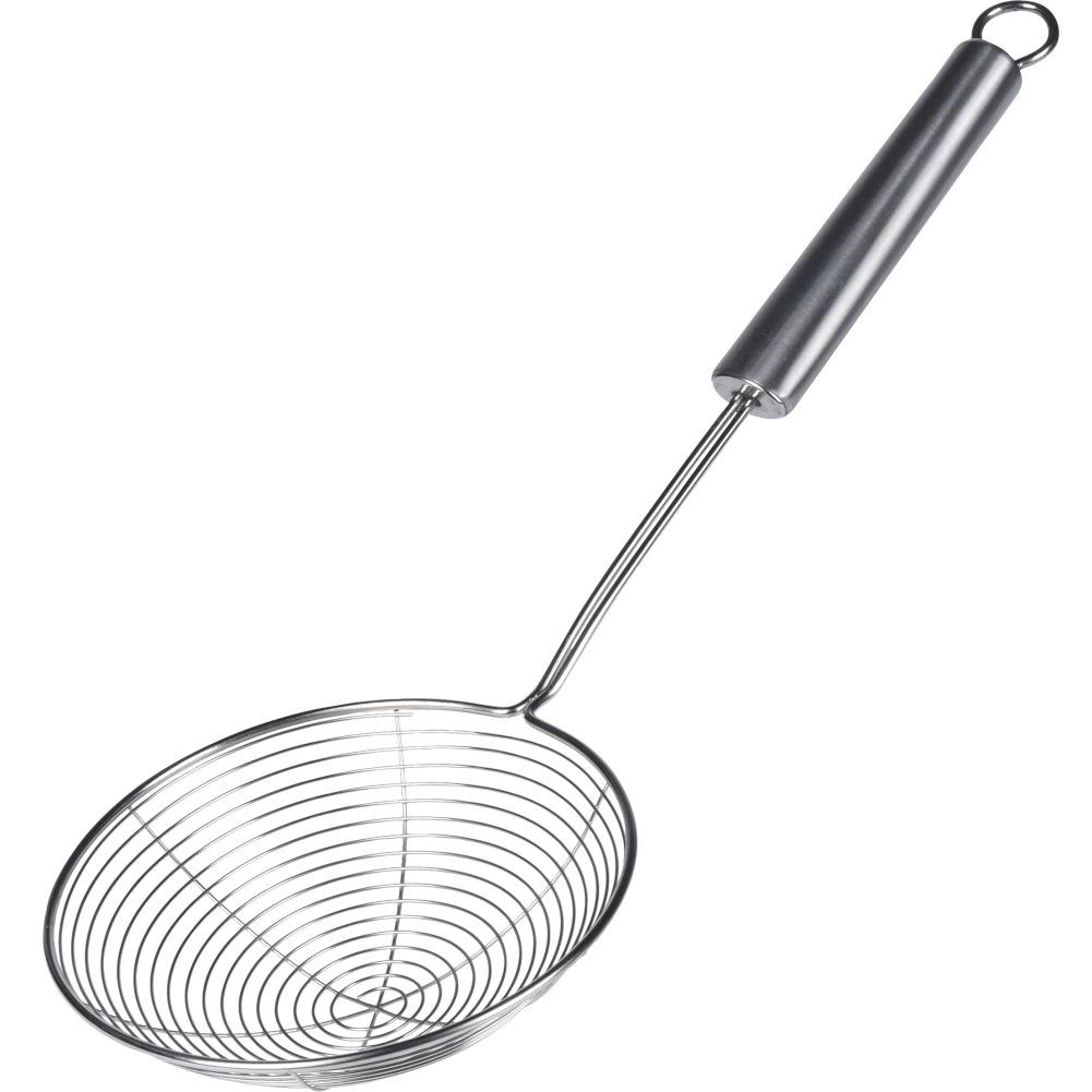 Długa rączka zapewnia bezpieczny zasięg nad gorącą parą i olejem, a oczko na końcu umożliwia zawieszenie na relingu i oszczędne przechowywanie. W pełni nierdzewne wykonanie jest odporne na korozję, higieniczne i nadaje się do zmywarki.