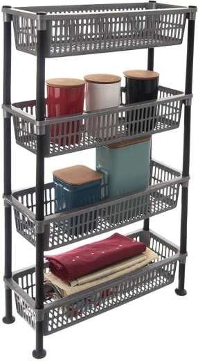 Praktyczny i wąski, 4‑poziomowy regał z wytrzymałego plastiku oferuje maksymalną przestrzeń do przechowywania nawet w małej łazience lub kuchni. Cztery wentylowane koszyki w kolorze szarym oraz czarna konstrukcja zapewniają łatwą pielęgnację, odporność na wilgoć i prosty montaż. Świetny do łazienki, kuchni, przedpokoju, na balkon i do warsztatu.