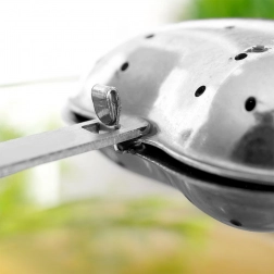 Sitko wykonane jest ze stali nierdzewnej w eleganckim srebrnym kolorze, jest wytrzymałe, higieniczne i łatwe do czyszczenia. Praktyczne zapięcie na zawias bezpiecznie utrzymuje herbatę liściastą lub zioła w środku. Świetnie sprawdzi się także do zaparzania ziół lub umieszczania przypraw podczas gotowania zup i wywarów.
