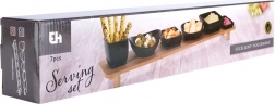 Elegancki 7‑elementowy zestaw do serwowania z czarnymi ceramicznymi miseczkami na podwyższonej bambusowej tacy o długości 50 cm. Idealny do przystawek, dipów, sosów i przekąsek. Miseczki mają różne kształty i pojemności, a taca z wyznaczonymi miejscami zapewnia stabilność podczas przenoszenia. Połączenie minimalizmu i nowoczesnego designu do stylowego serwowania w domu i gastronomii.