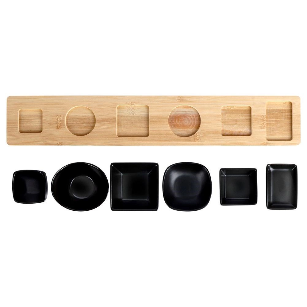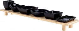 Ten designerski zestaw łączy praktyczność i estetykę w codziennym serwowaniu. Sześć ceramicznych miseczek w czarnym kolorze uzupełnia solidna bambusowa podstawka na nóżkach, która wszystko czytelnie organizuje i elegancko unosi ponad blat. Dzięki precyzyjnie wyprofilowanym wnękom miseczki pozostają na swoim miejscu także podczas przenoszenia.