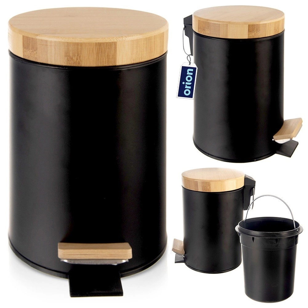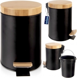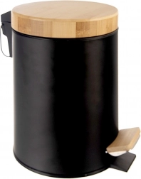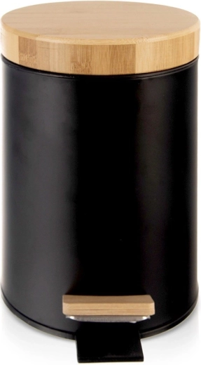 Kompaktowy kosz na śmieci o pojemności 3 l w eleganckim czarnym kolorze z bambusową pokrywą i pedałem jest idealny do łazienki, biura lub sypialni. Dzięki otwieraniu pedałem bez użycia rąk użytkowanie jest maksymalnie higieniczne, wyjmowany wewnętrzny pojemnik ułatwia opróżnianie i czyszczenie, a matowy metal z bambusowymi akcentami doskonale wpasuje się w nowoczesne wnętrza.