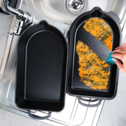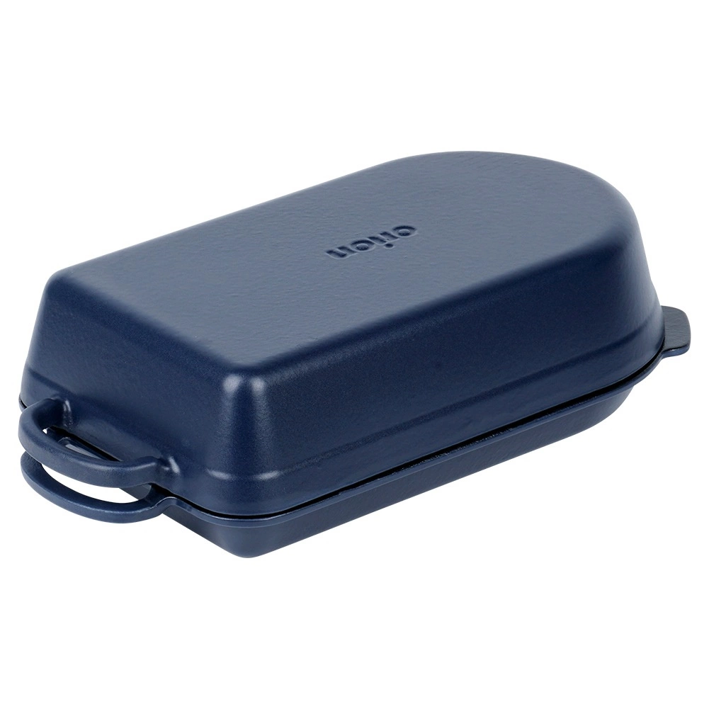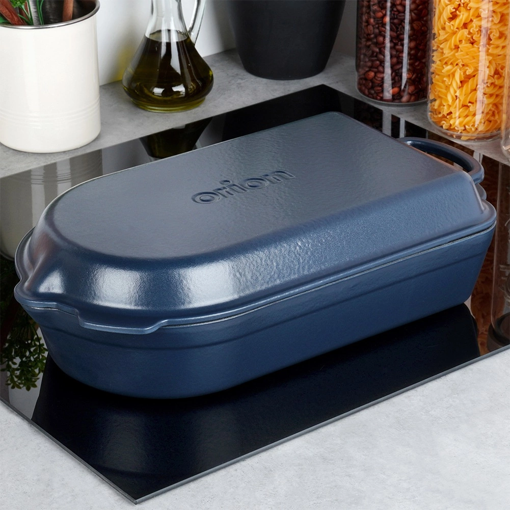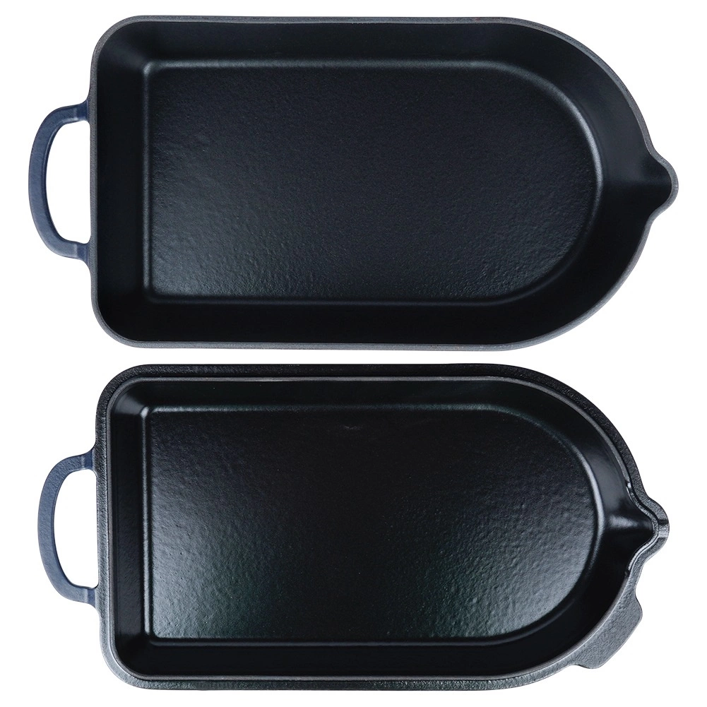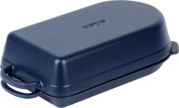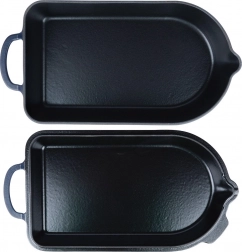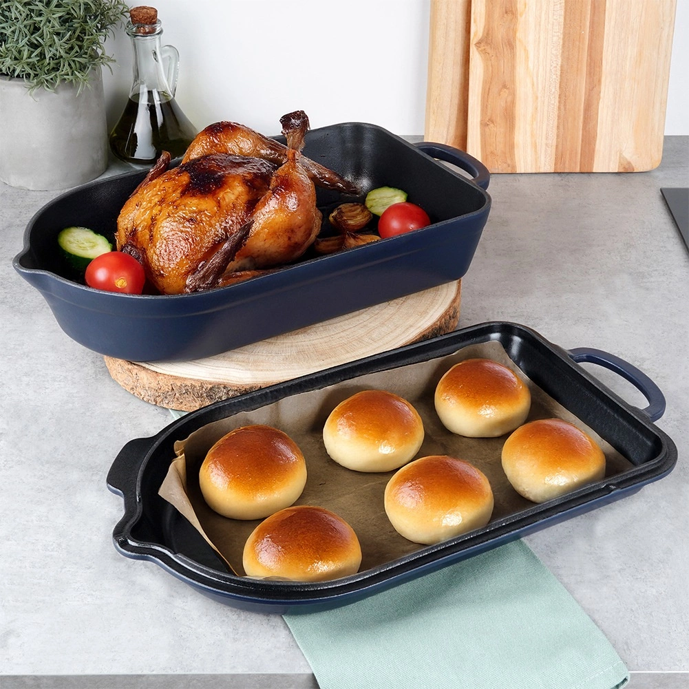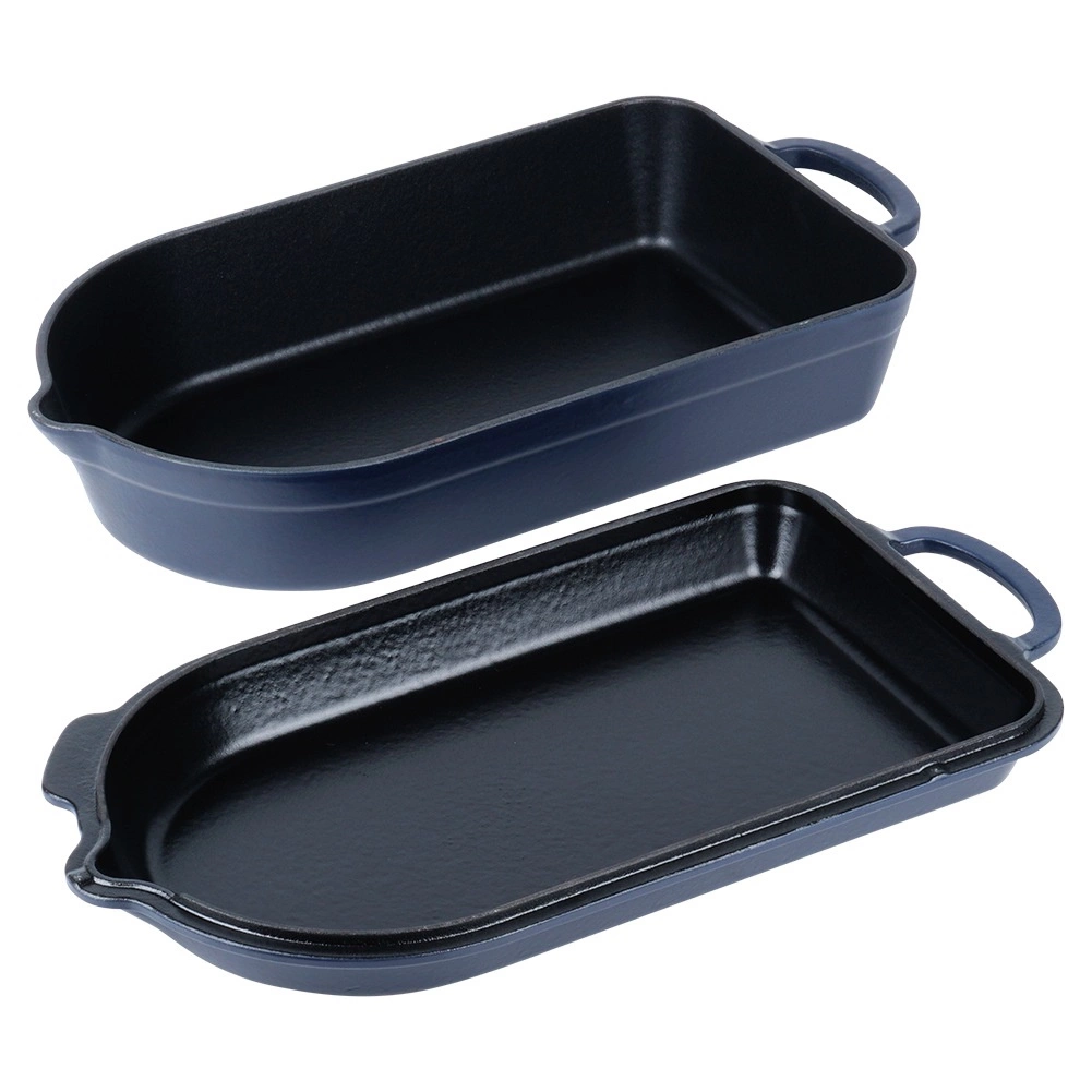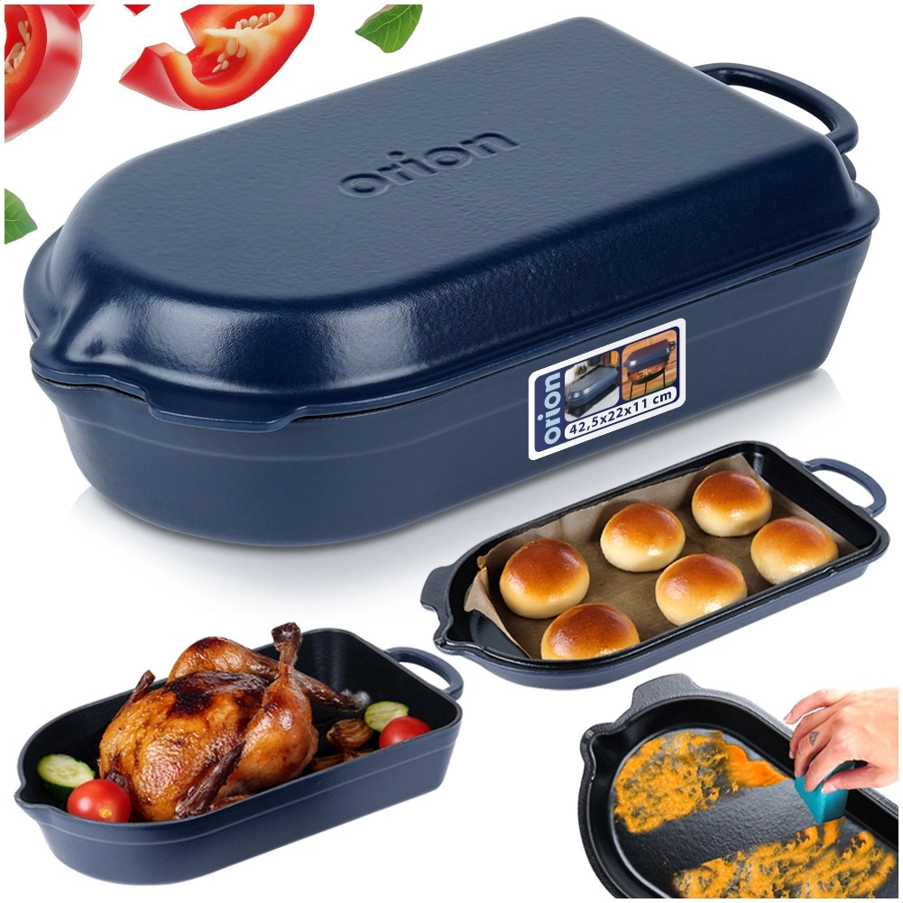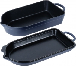 Wewnętrzna czarna emalia ułatwia smażenie, zapiekanie i pielęgnację, a zewnętrzna ciemnoniebieska glazura nadaje elegancki wygląd do serwowania prosto na stół. Naczynie odpowiednie na kuchenki gazowe, elektryczne, ceramiczne, halogenowe i indukcyjne oraz do piekarnika do 250 °C. Obie części mają praktyczne wylewki do łatwego zlewania sosu i bezpieczne uchwyty do wygodnego przenoszenia.